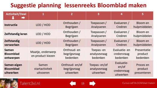 Hiernaast een gratis samenvatting van de onderstaande cursus. Deze samenvatting is ook door de leerlingen zelfstandig te gebruiken als leidraad, nadat zij van de leerkracht óf middels onderstaande cursus uitleg en oefening hebben gehad in het zelf maken van een Bloomblad.